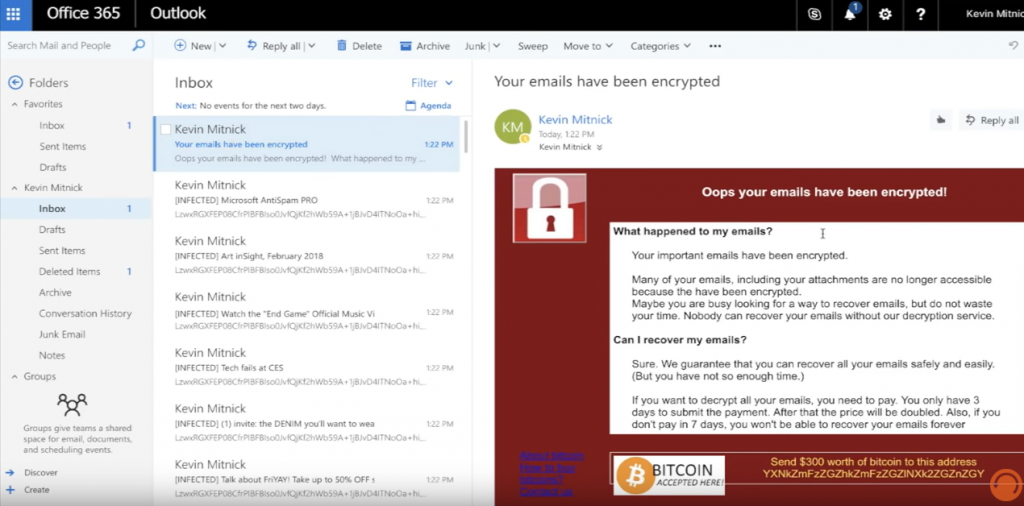 Nadat de aanvaller zo’n oAuth token heeft verkregen heeft hij vrij spel, hij start een automatisch encryptie proces op wat AL je e-mails in je mailbox zal encrypteren en onleesbaar zal maken. Finaal laat hij 1 leesbare e-mail achter met daarin de melding dat je mailbox encrypted is en met de vraag om een bedrag in bitcoin over te schrijven om zo je mailbox terug te laten decrypteren.