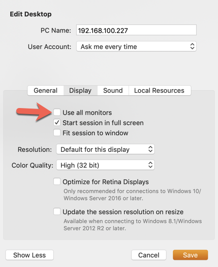 - OPTIONEEL: Heb je meerdere schermen en wenst je je desktop op beide schermen te kunnen gebruiken klik dan vervolgens op Display en vink ‘Use all monitors’ aan.