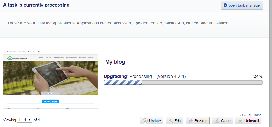 Het installatron menu opent zich, je krijgt hier een overzicht van alle door jouw geinstalleerde applicaties met Installatron. Wanneer er een update beschikbaar is van de applicatie zal er een rood pijltje verschijnen naast de applicatie. Klik hierop om de update te lanceren